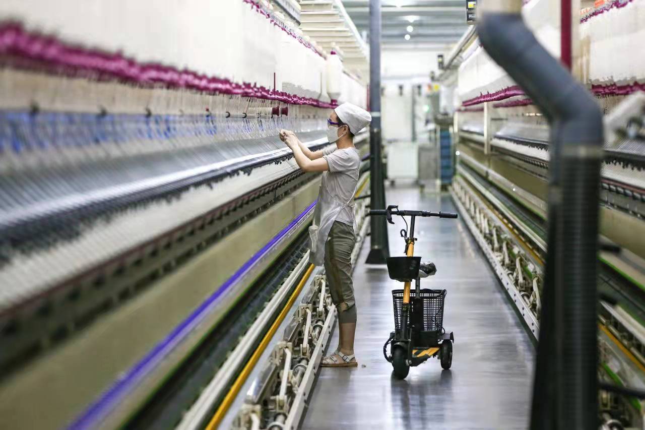 3月29日,在枣阳市万通棉纺实业有限公司的智能数字化纺纱车间内,上万纱锭欢快地高速旋转,偌大的车间里却只有几名工人骑着小型电动车在近百米长的机器间来回巡查。杨东摄