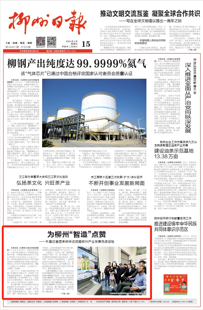 提要:3月12日至14日,百国记者中国行——看中国式现代化广西实践活动在柳州开展。中国国际新闻交流中心外国记者团的13名记者深入企业生产一线,在高效运转的自动化生产线中挖掘各园区在智转数改等方面的先进经验,同时在山水风光中感受民族风情,领略“工业城市中山水最美,山水城市中工业最强”的神韵。中国日报双语新闻、广西日报视频号、《柳州日报》、柳州新闻等媒体关注报道。