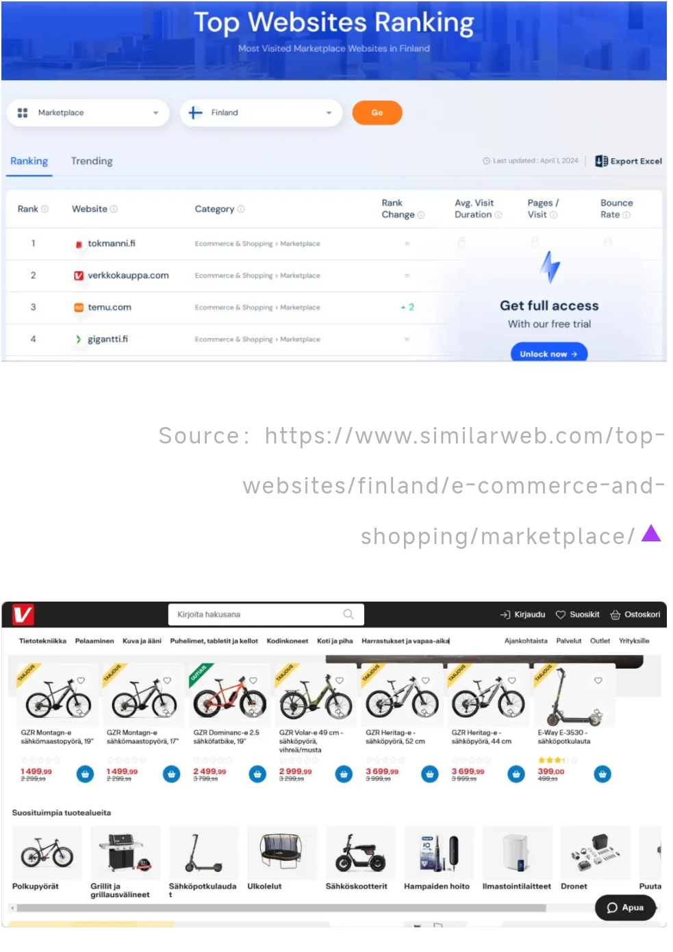 芬兰电商市场主要由本土、中国、德国和瑞典平台占据。根据Similarweb.com2024年3月份的统计数据,Tokmanni位居芬兰电商平台榜首,verkkokauppa位居第二。