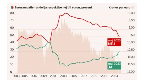 瑞典民众对加入欧元的支持也随着汇率的波动而明显变化:瑞典统计局调查中对欧元支持率最高的时期与克朗疲软的时期高度重合。即将于2024年5月进行的调查显示,克朗在一年内相对于欧元又贬值了大约5%。
