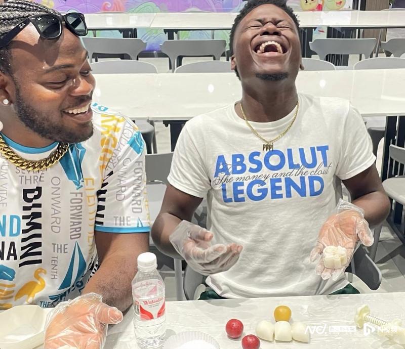 来自格林纳达的喜剧视频博主奧马里·彼得斯(OmariPeters)接受采访期间,巴哈马旅游博主阿什德·贝恩(AshadBain)在他身旁举着一部手机,时不时用其记录和中国记者们面对面的场景。