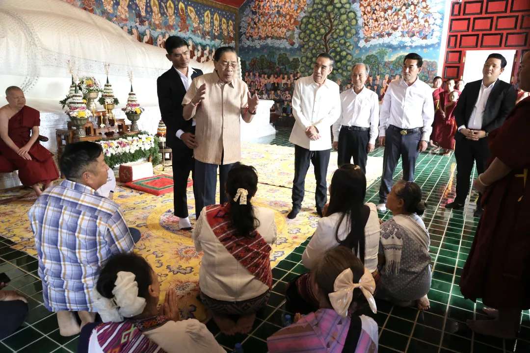 President Choummaly and Chairman Zhao also visited rural fields and temples,sitting down with residents to better understand their lives and needs.News of their arrival quickly spread,and villagers from far and wide gathered to meet them.