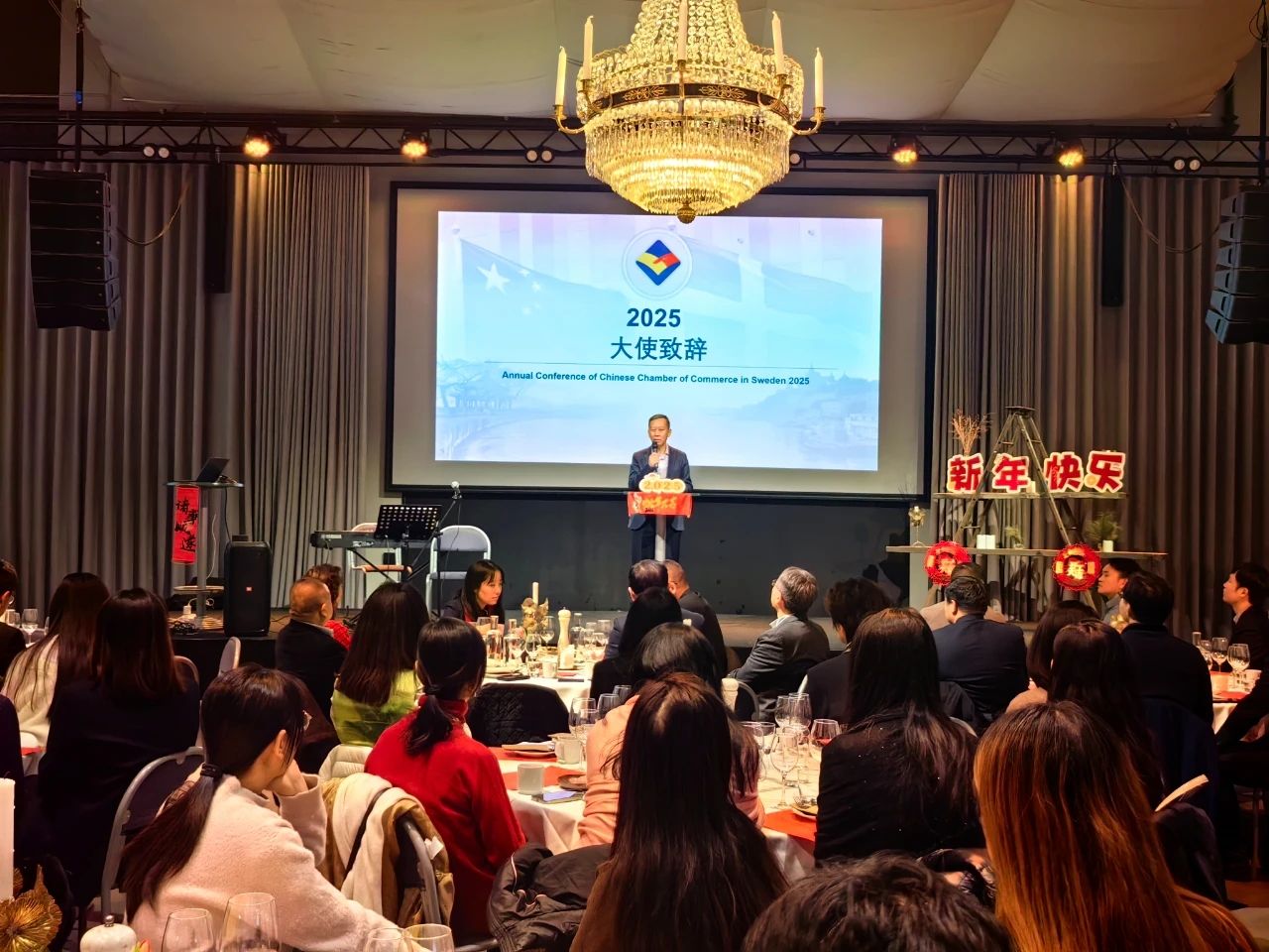 2025年1月10日,驻瑞典大使崔爱民应邀出席2025瑞典中国商会年会,使馆负责经济商务事务的参赞康文、商会会长李洪钟及会员单位负责人共50余人出席。