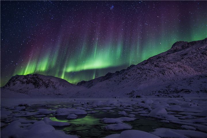 每到冬季,便有持续数个月的极夜,格陵兰上空偶尔会出现色彩绚丽的北极光,它时而如五彩缤纷的焰火喷射天空,时而如手执彩绸的仙女翩翩起舞,给格陵兰的夜空带来一派生气。