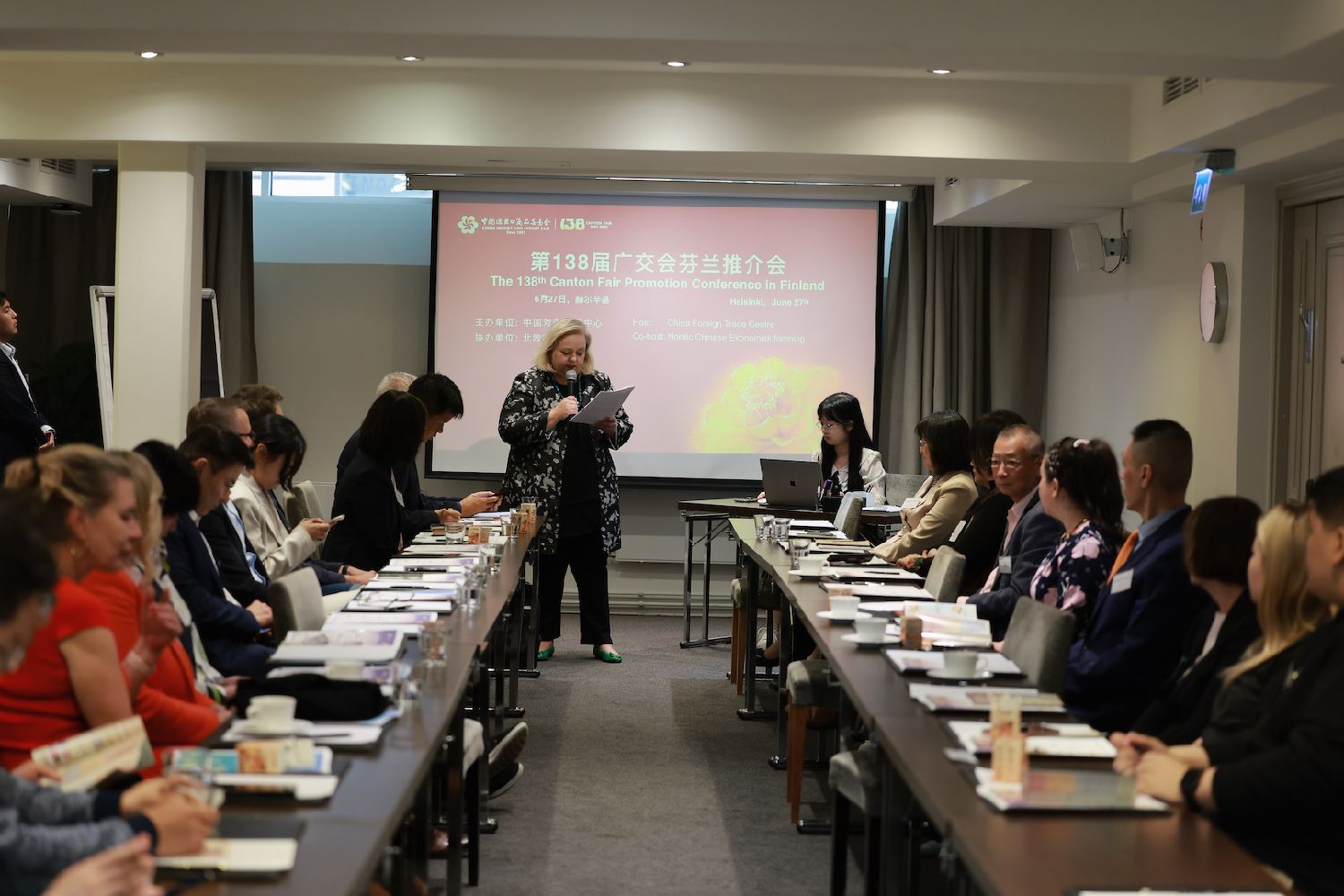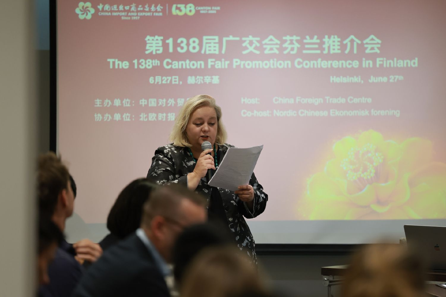 “仲夏喜气洋洋,瑞气芬芳,商家云集。今天我们在赫尔辛基共聚一堂,迎接一个联结中芬商贸的美好时刻。”Rebekka说道。她本人曾在广州生活十余年,现居芬兰,长期致力于推动中芬文化经济交流,被誉为“中芬民间友好使者”。