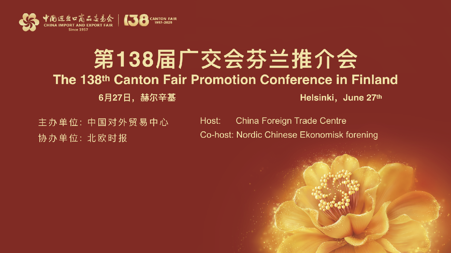 (北欧时报赫尔辛基6月27日讯)2025年6月27日,由中国对外贸易中心主办、北欧时报协办的“第138届广交会芬兰推介会”在芬兰首都赫尔辛基成功举办。本次活动汇聚了中芬政府代表、工商界精英、科技企业领袖及媒体代表,在芬兰仲夏节这一传统佳节之际,共同开启一场中芬合作的高光时刻,谱写了新时代中芬经贸交流与民间友好互动的新篇章。
