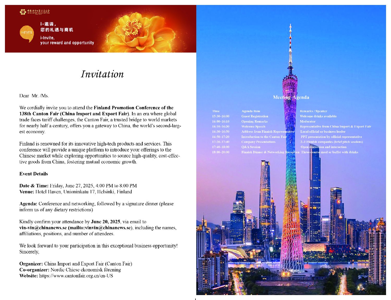 138.Kantonin messujen Suomi-tapahtuma onnistui erinomaisesti–ei vain messuesittely vaan myös diplomaattinen vahvistus,kansalaisyhteyden lämpöja teknologian&kulttuurin kaksisuuntainen matka.Maailman kaupan epävarmuudesta huolimatta tapahtuma viestitti Kiinan ja Suomen sitoutumista avoimuuteen,yhteistyöhön sekäwin-win-periaatteeseen.Tulevaisuudessa kyse on paitsi kaupoista,myös vihreästäkehityksestä,digitaalisesta taloudesta ja kulttuurivaihdosta syvemmällätasolla.