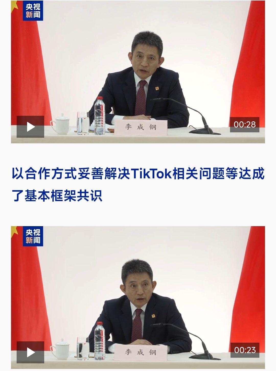李成钢表示,双方围绕TikTok及中方有关关切进行了坦诚、深入交流,就以合作方式妥善解决TikTok相关问题,减少投资障碍,促进有关经贸合作等达成了基本框架共识。