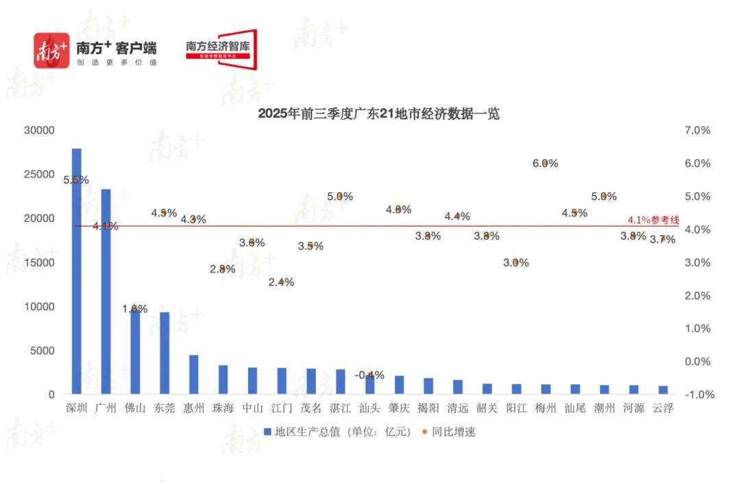 前三季度,珠三角九市的经济总量在全省占比超过八成,四座“万亿城市”占比超六成。其中,广州、深圳两座“双子星”城市的表现亮眼。