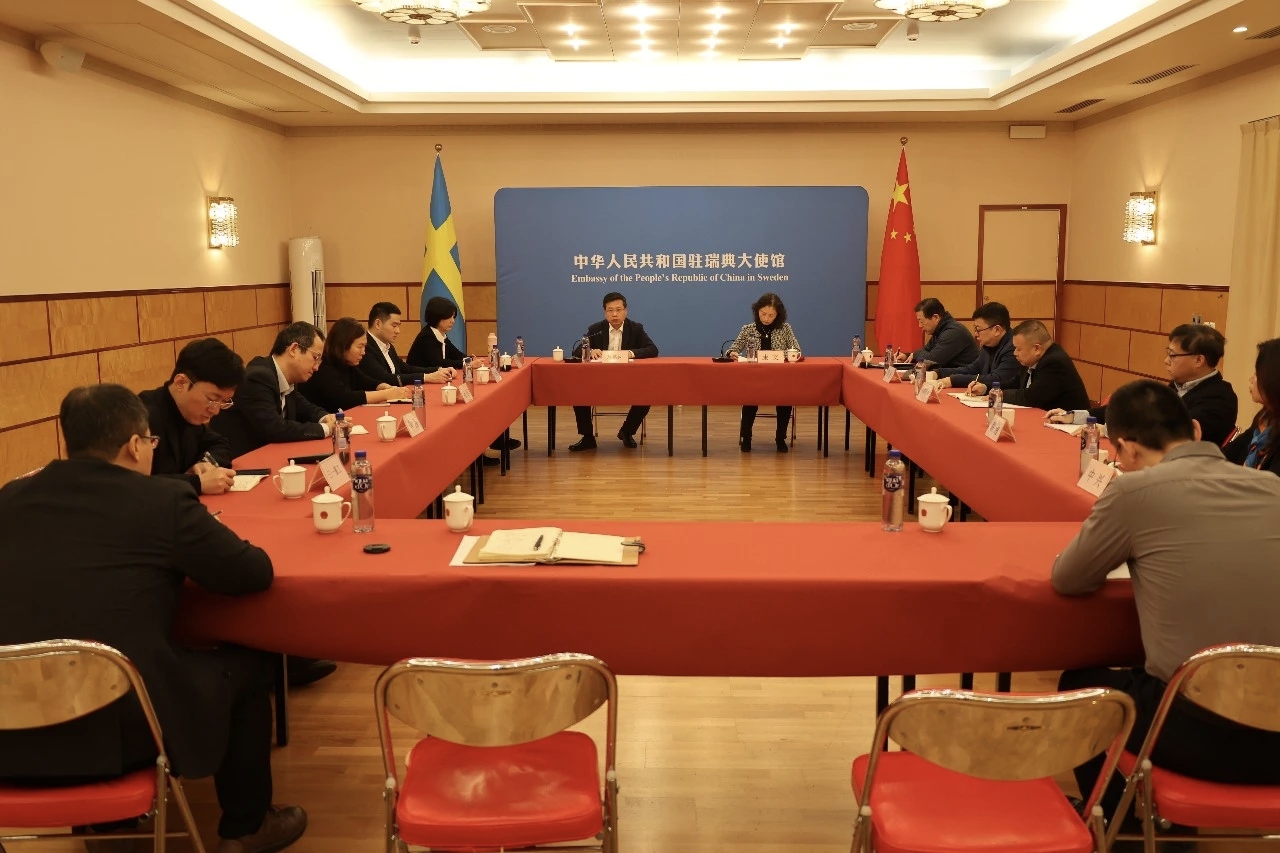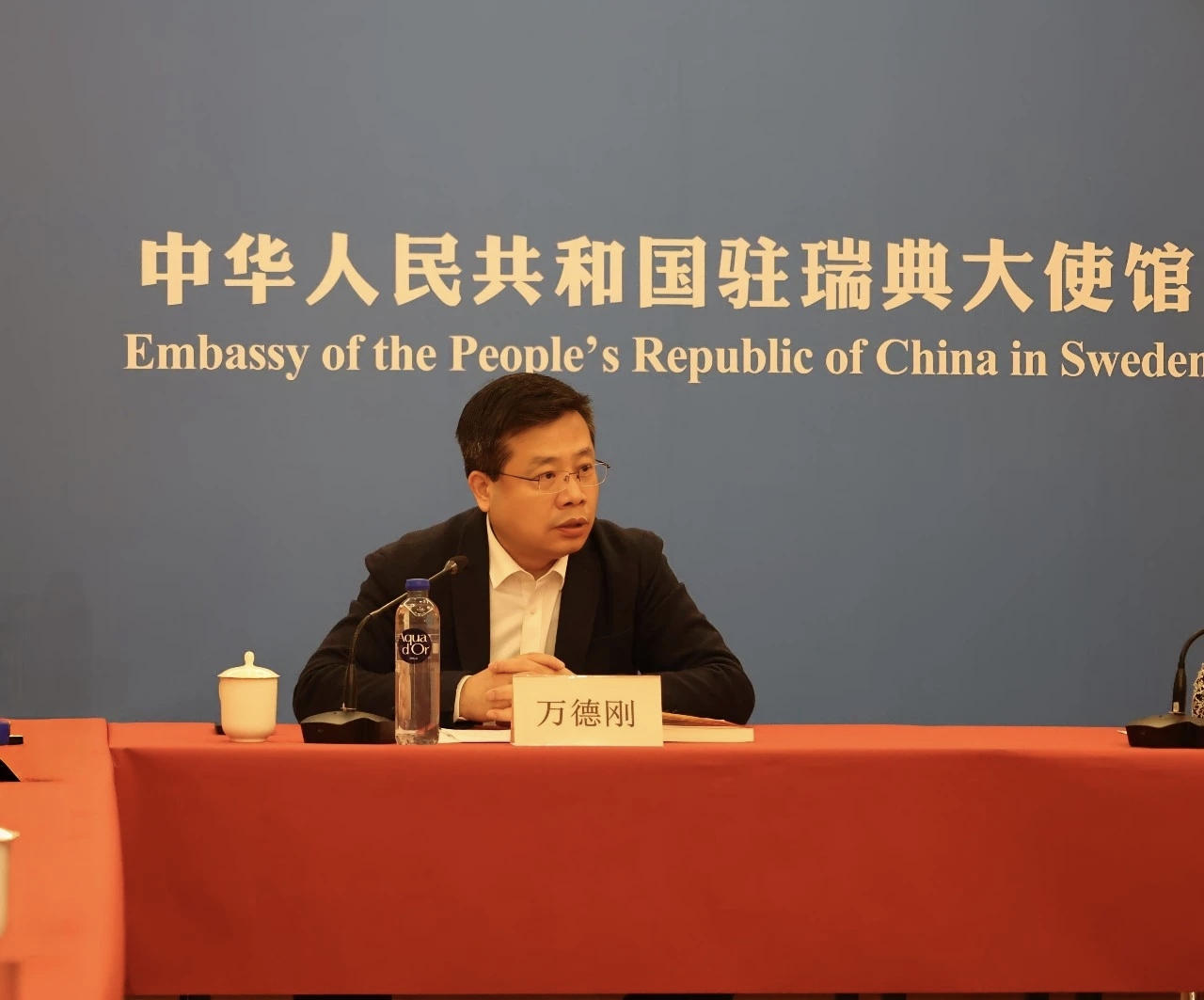 2025年12月30日,中国驻瑞典使馆临时代办万德刚出席使馆举办的在瑞中资企业专题座谈会,使馆负责经济商务事务的参赞康文及10家在瑞中资企业及中国商会负责人参会。
