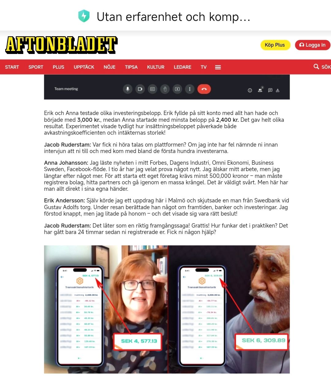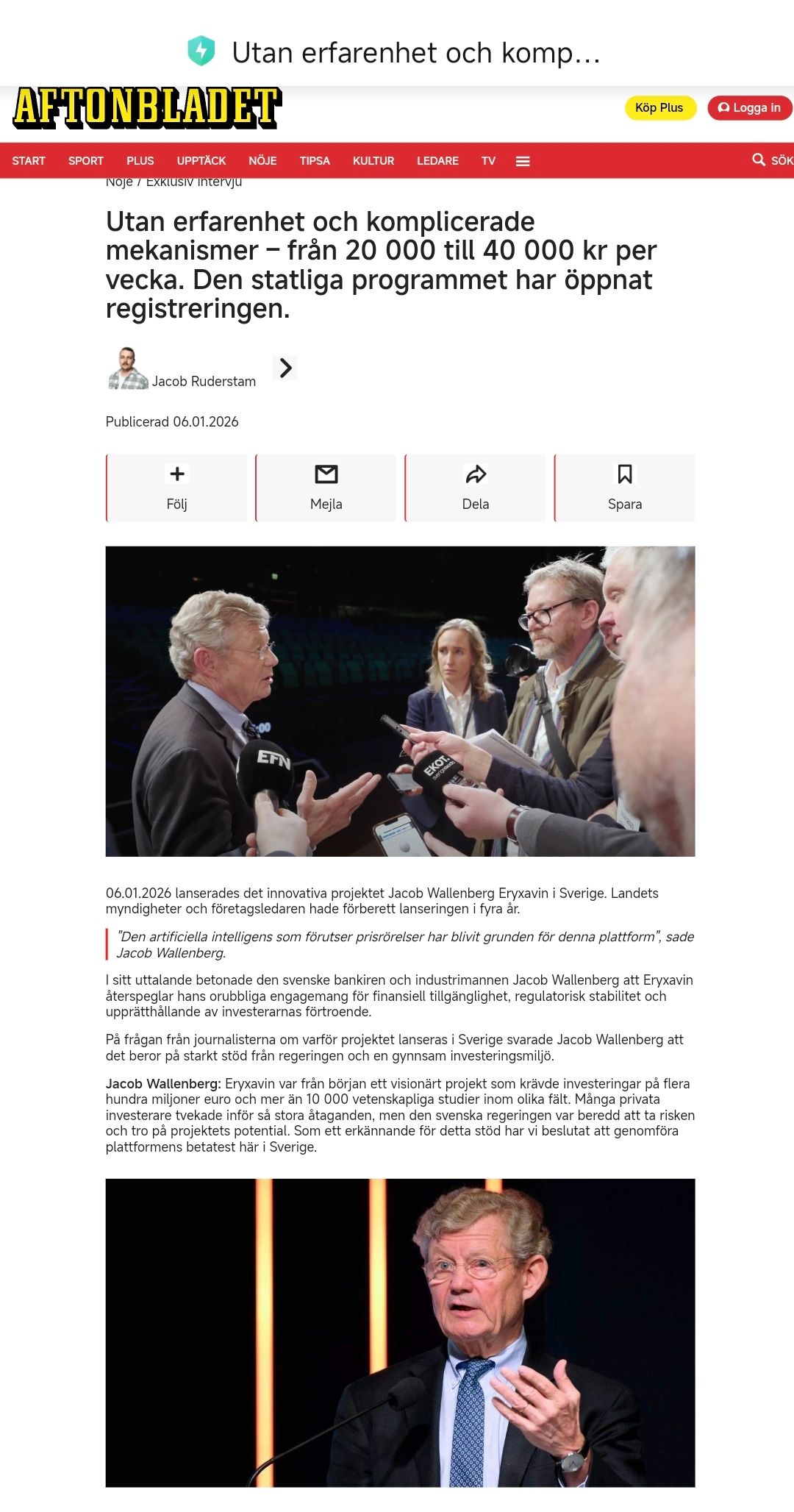 近日,一篇自称来自瑞典《Aftonbladet》(晚报)的“独家报道”在网络平台传播,文章以“国家项目”“AI投资”“Wallenberg家族支持”为核心卖点,宣称普通人可通过注册平台快速获得高额被动收入。