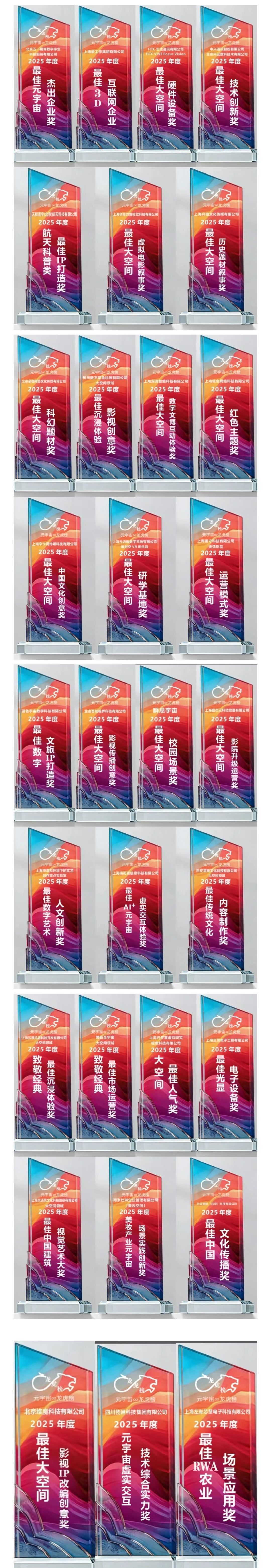 (获奖名单:2025年度最佳合作伙伴,行业领军企业,优秀企业,最佳编剧)2025年度最佳合作伙伴1.上海蓝天经济城2.中国广告协会文创与IP协会3.中国文化产业协会元宇宙专委会4.上海浦东新区科幻协会5.上海创邑实业有限公司6.上海中玩城科技有限公司行业领军企业1.北京小鸟看看有限公司2.上海元梦堂虚拟现实信息科技有限公司3.中鼎天下(北京)文化科技有限公司4.亮风台(上海)信息科技有限公司5.上海元语宙数字科技有限公司6.上海瑞而克信息科技有限公司7.西安大千迷境科技有限公司8.上海圣瞬无线科技有限公司优秀企业1.慧同(上海)视觉艺术设计有限公司2.南京大狮文创有限公司3.上海一尺视界数码科技有限公司4.上海艾洛沃尔数字科技有限公司5.四川中绳矩阵技术发展有限公司6.南京仕琳企业管理有限公司7.阿历克斯科技(上海)有限公司8.上海哔兔哔科技有限公司最具投资潜力企业上海玩出梦想科技有限公司最佳编剧1.宇宙猜想(北京)科技有限公司才可2.上海兴格文化传媒有限公司蔡文怡3.上海创享灵境视觉科技有限公司张亦弛4.北京君看文化传媒有限公司高婕妤