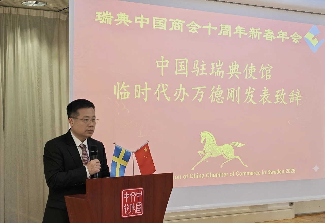2026年2月12日,中国驻瑞典使馆临时代办万德刚应邀出席瑞典中国商会2026年年会并致辞。使馆负责经济商务事务的参赞康文及商会会员企业代表50余人参加。