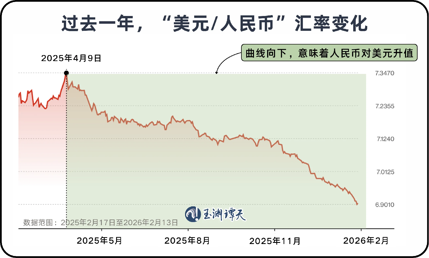 但仅用“美元走弱”并不足以解释人民币这一轮升值的节奏。观察人民币兑美元汇率走势,可以发现一个关键时间节点——2025年4月9日。