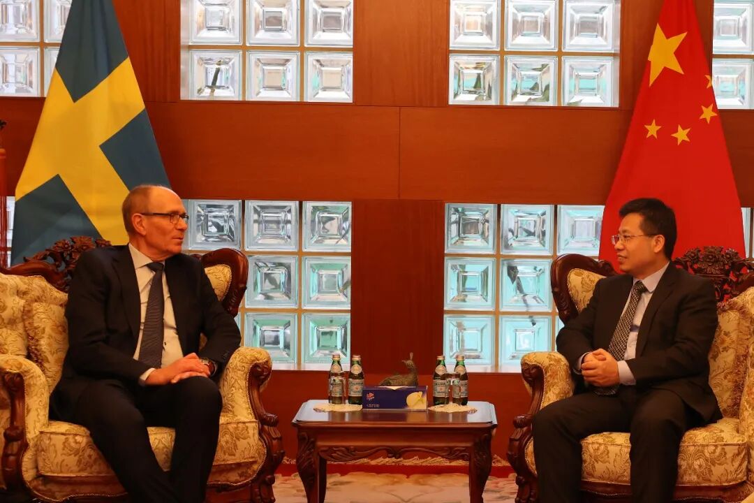 Den 4 mars 2026 träffade Wan Degang,tillfällig Charge d'Affaires på den kinesiska ambassaden i Sverige,ordföranden för Sverige kina Handelskammaren,Per Persson,och andra styrelsemedlemmar.De gick igenom utvecklingen av de kinesisk-svenska ekonomiska och handelsrelationerna och hade ett vänskapligt och djuplodande utbyte om att stärka det ekonomiska och handelsmässiga samarbetet mellan de tvåländerna under de nya omständigheterna.Kang Wen,ambassadens rådgivare med ansvar för ekonomiska och kommersiella frågor,deltog ocksåi mötet.Ordförande Per Persson och andra uttryckte att när Kinas dörrar till högnivå-öppning blir allt bredare,kommer svenska företag att få allt fler utvecklingsmöjligheter i Kina.Sverige kina Handelskammarenär villig att tillsammans med alla sektorer i Sverige arbeta hand i hand för att skapa enännu vackrare framtid för det bilaterala ekonomiska och handelsmässiga samarbetet.