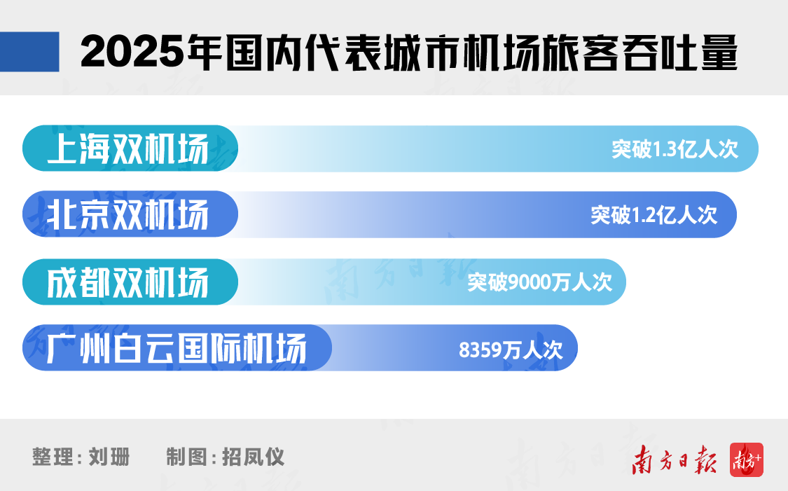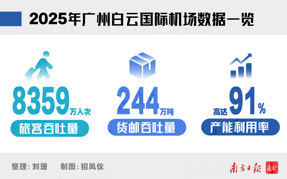 广州白云国际机场是全球最繁忙的单体机场之一。2025年,其旅客吞吐量达到创纪录的8359万人次,货邮吞吐量244万吨。目前的产能利用率高达91%,三条跑道已处于满负荷甚至超负荷运转状态。