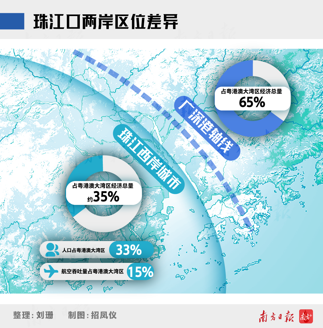 清华大学中国新型城镇化研究院和清华同衡规划设计研究院的研究表明,东强西弱城市梯队自2010年以来趋于固化,目前粤港澳大湾区65%的经济总量集中在广深港,而西岸的珠海、中山、肇庆、江门等城市,虽然人口占了大湾区的33%,GDP占了约35%,但航空旅客吞吐量仅占15%。