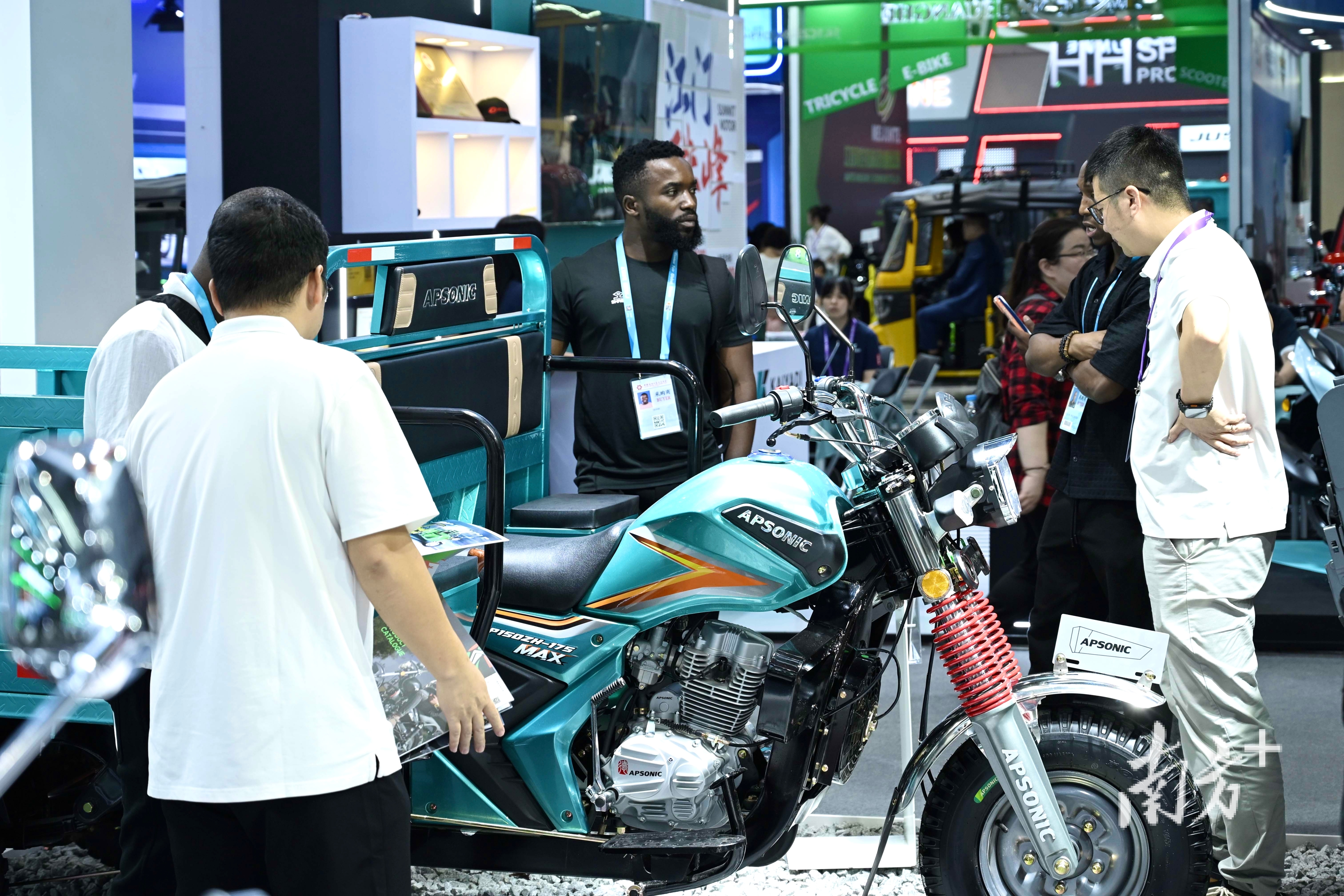 江门正豪摩托车有限公司展位前,天豪太子X9增程式电摩首发亮相,便吸引了各国客商驻足询问。