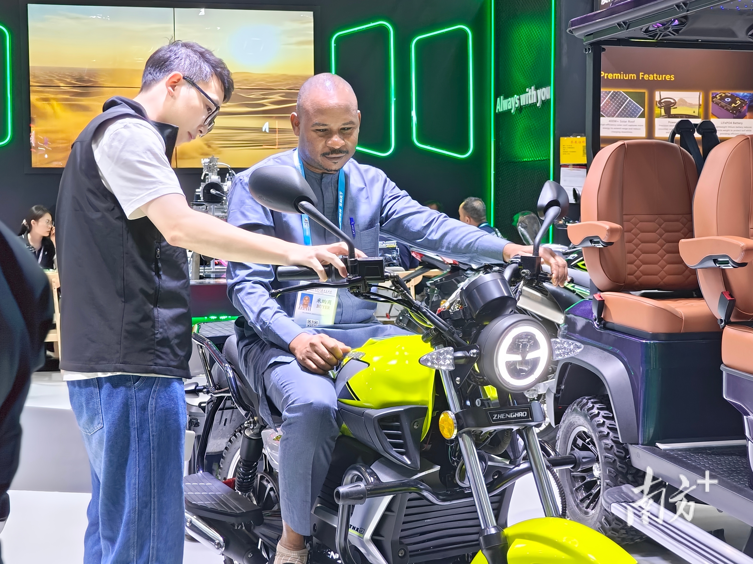 广交会展馆内人声鼎沸,江门正豪摩托车有限公司展位前,拥有亮绿色潮酷外观的天豪太子X9增程式电摩首发亮相,便吸引了各国客商驻足询问。有人掀开侧板研究增程器布局,有人蹲下去观察底盘结构,更多人拿着参数单反复确认续航与能耗。