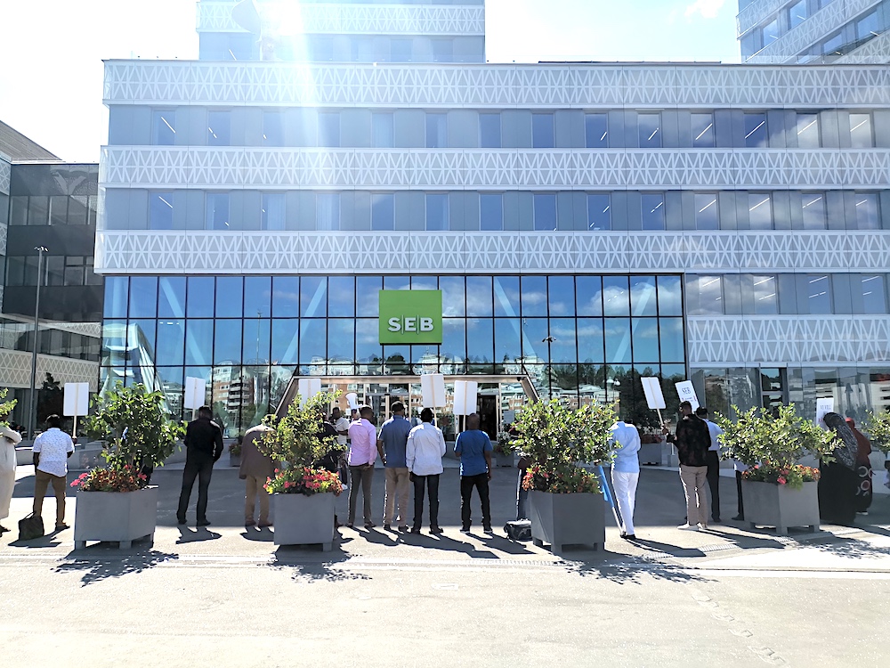 周五下午三点,一些貌似移民群众聚集在Solna Mall Scandinavia 瑞典SEB银行大厦门前抗议,据他们举牌的口号端测,他们的诉求主要是要银行给他们钱买牛奶、买面包,大瘟疫已经造成很多人无米下锅,求银行开闸“放水”。/北欧时报 图