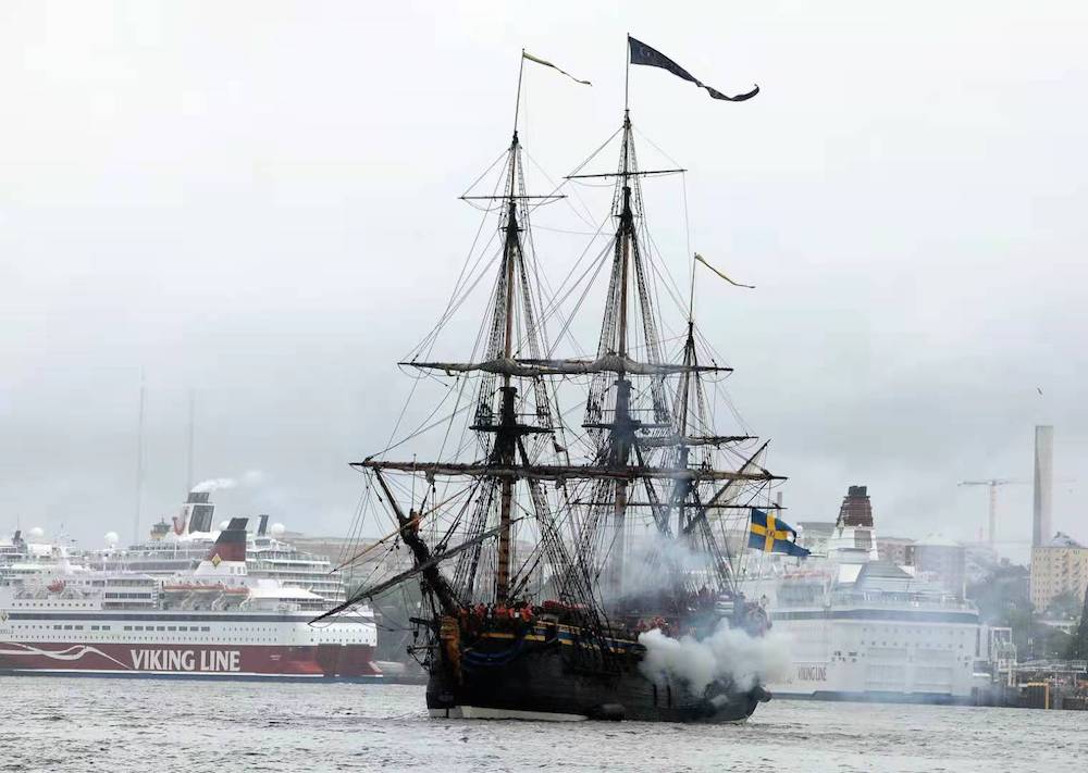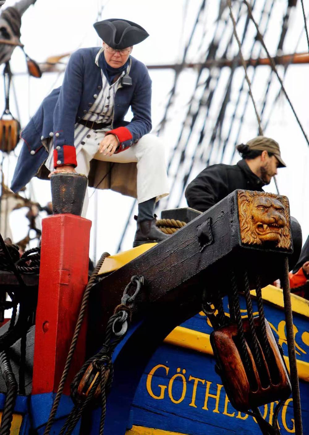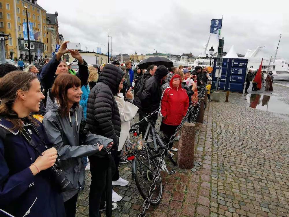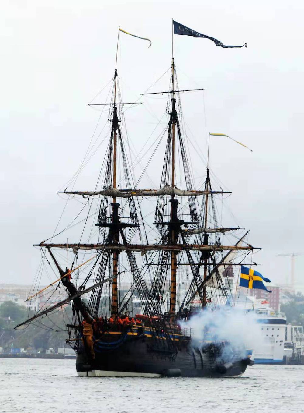 秋雨霏霏中,代表中瑞友谊的仿古帆船“哥德堡号”8月26日下午到达斯德哥尔摩,为将在明年春季启航到上海航程作热身准备。哥德堡号完全按照18世纪航行习俗,在驶入港口时鸣放礼炮,水手登上三个桅杆高处向斯德哥尔摩致意!船长走下船向大家挥帽致敬!(摄影版权图片: 庞其铭)