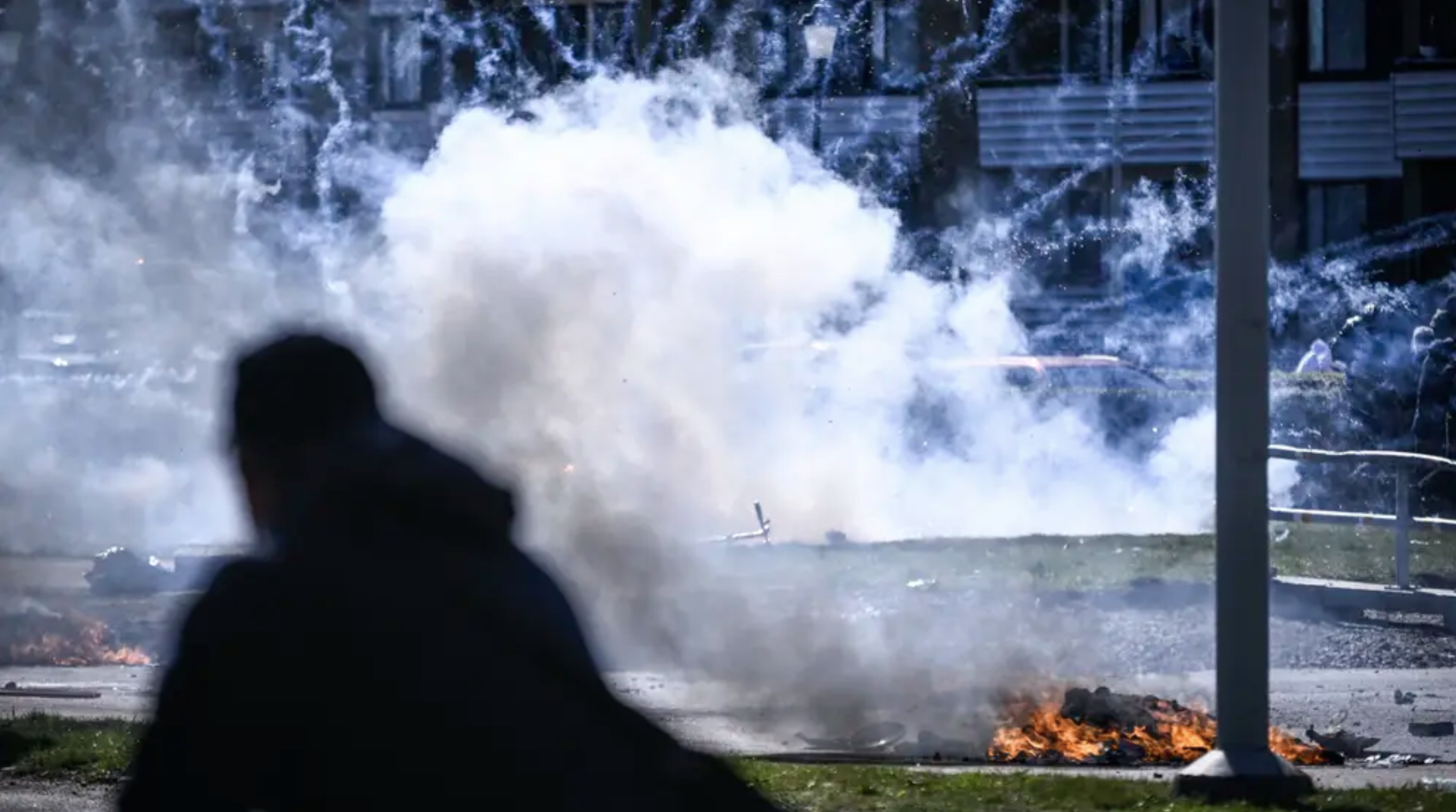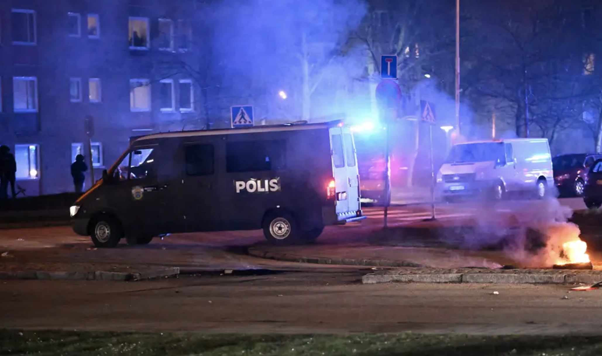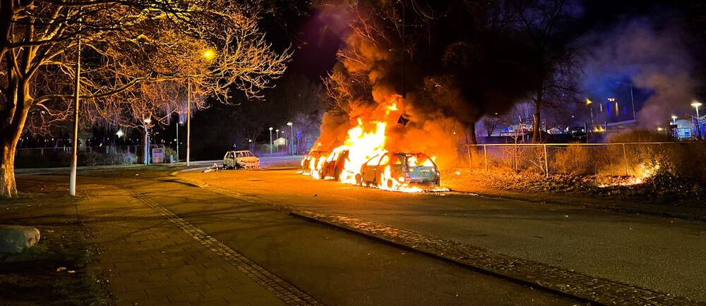周六晚间,在丹麦右翼极端主义政党TightCourse组织焚烧古兰经之后,正值复活节的周末瑞典几个城市发生了暴力骚乱。图为瑞典第三大城市马尔默发生骚乱街头几辆汽车被焚烧的现状。/瑞典电视台网
