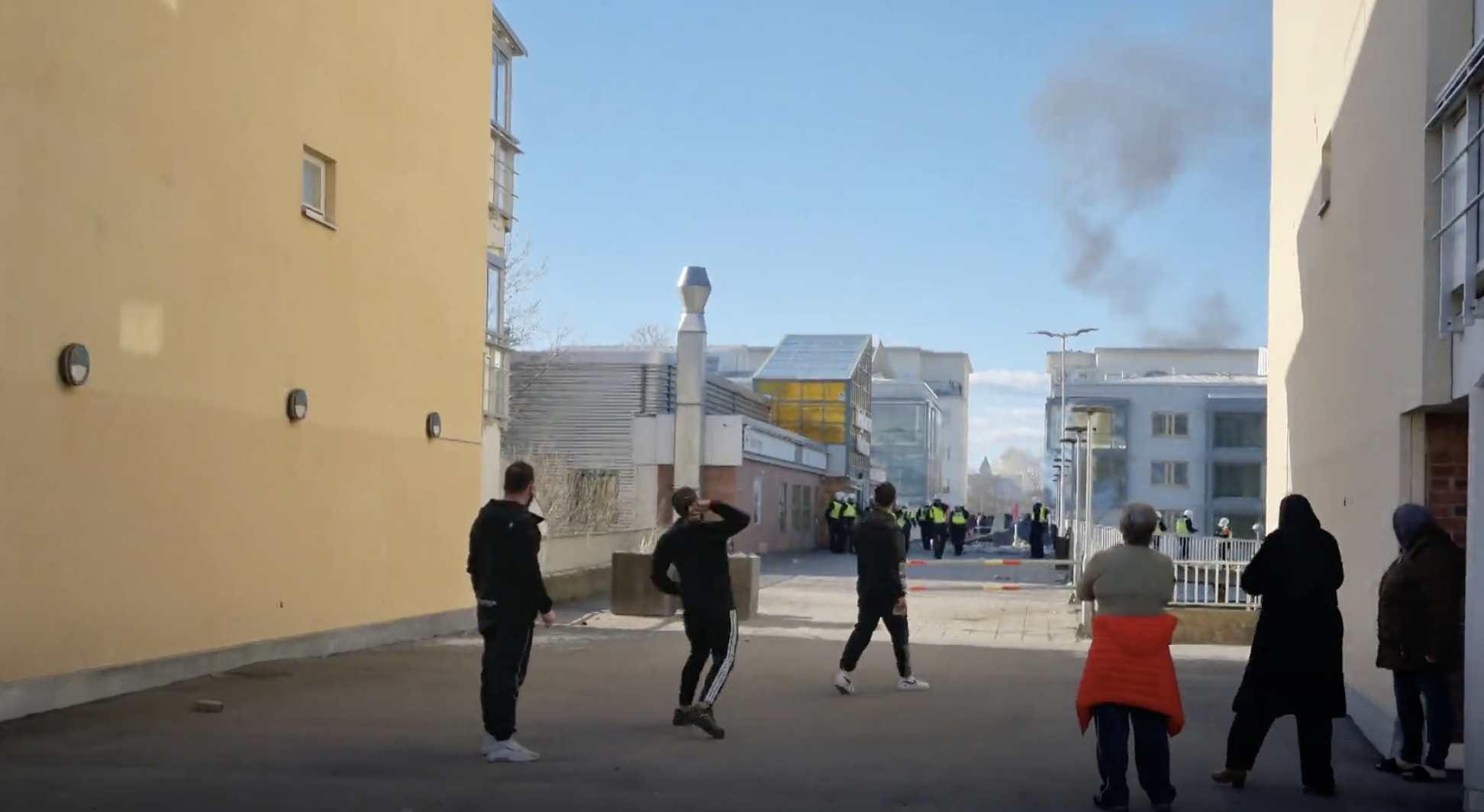 周日,暴力骚乱事件迅速蔓延到林雪平和诺雪平市,暴徒向警察投掷石块并点燃路边一些汽车。图为警察在一座桥上被从两个方向的暴徒攻击,人身安全受到威胁,随后鸣枪示警,其中三歹徒中枪。骚乱后共有十人被送往医院,大多数人受轻伤。警方周日晚上向媒体通报,骚乱基本平息,共有18人在林雪平被捕,8人在诺雪平被捕,其中林雪平的一名警察受了轻伤。照片:瑞典电视台网
