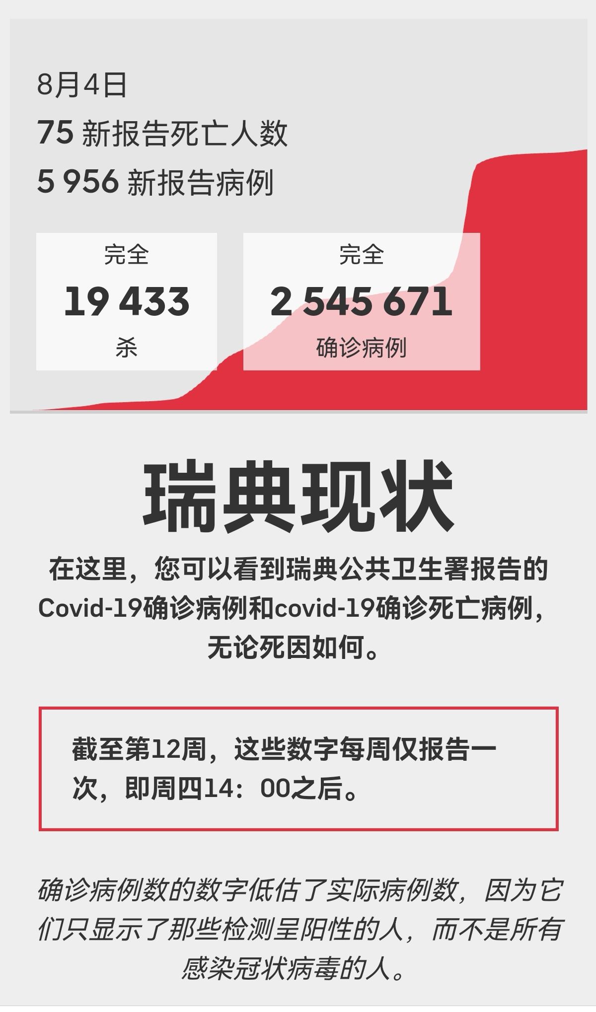 这是瑞典8月4日发布的疫情报告,显示上周新增新冠死亡75例,累计新冠死亡19433例,新增确诊5956例,累计确诊254万5671例(瑞典总人口1100万)。
