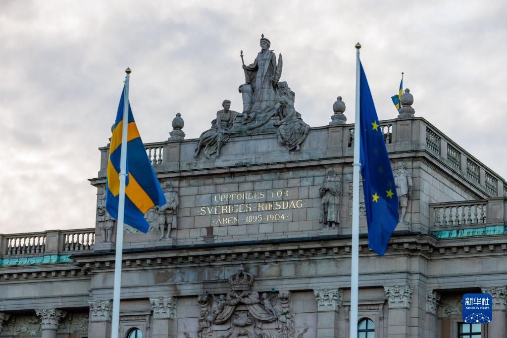 1月1日,在瑞典首都斯德哥尔摩,瑞典议会大楼外悬挂瑞典国旗和欧盟旗帜。新华社图