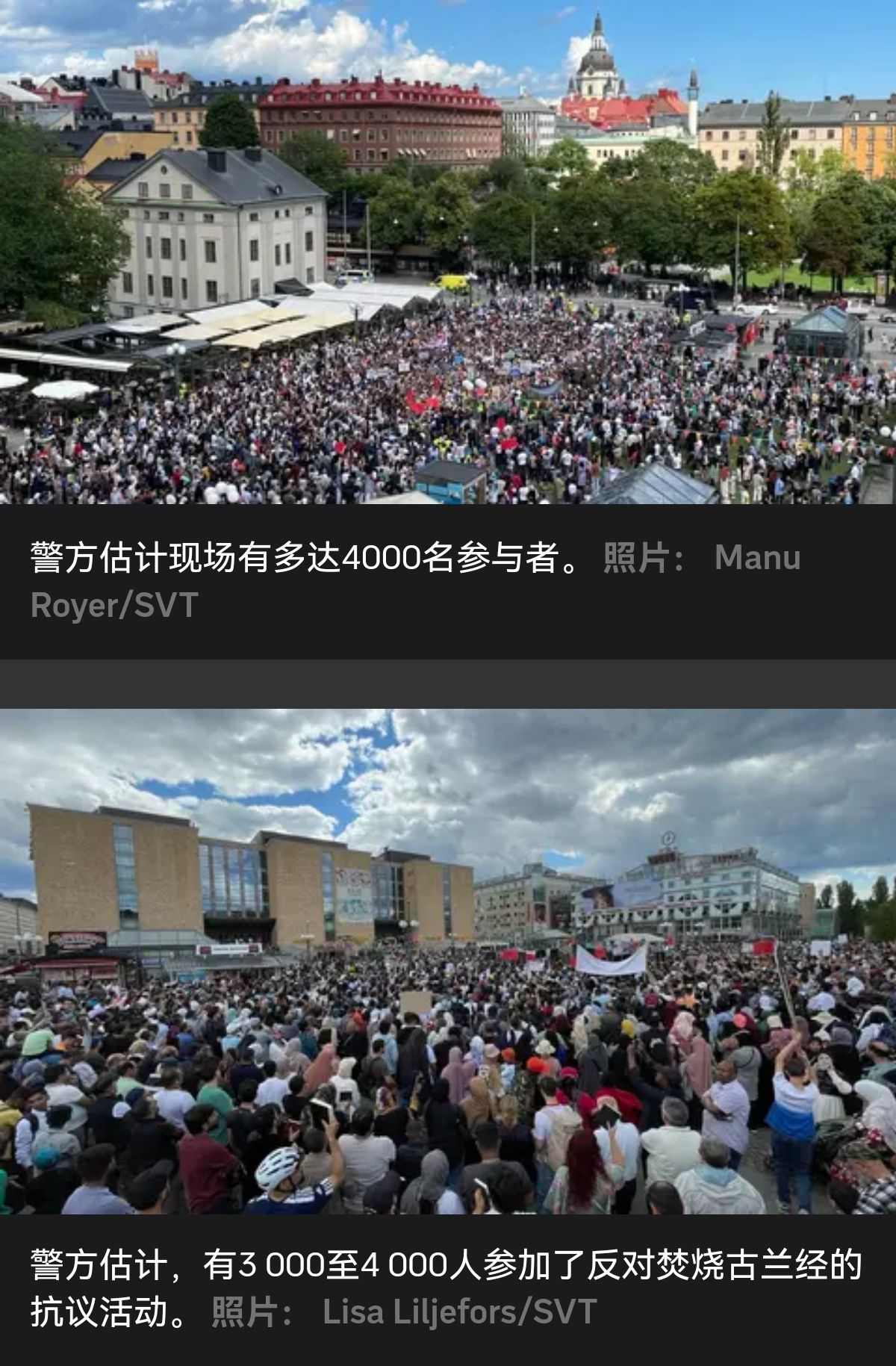(据瑞典电视台网报道)周日,数千人聚集在瑞典首都斯德哥尔摩南城公民广场,抗议瑞典焚烧古兰经。此前好几起备受瞩目的古兰经焚烧事件让不同国家的穆斯林感到愤怒,最近的一次焚烧事件是在斯德哥尔摩的清真寺外。