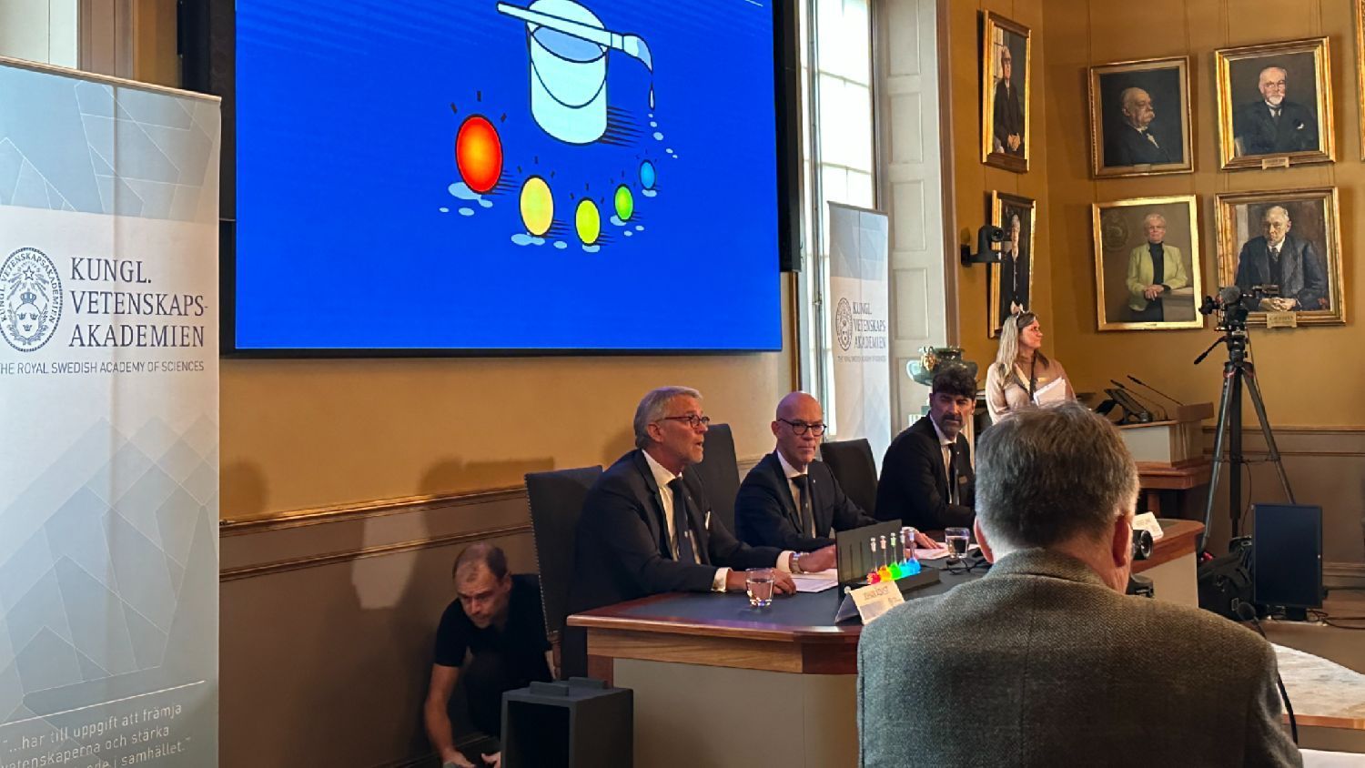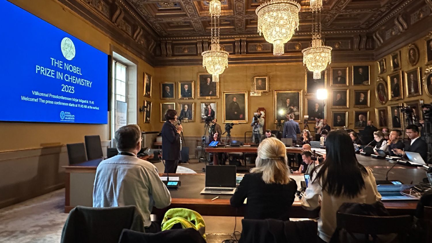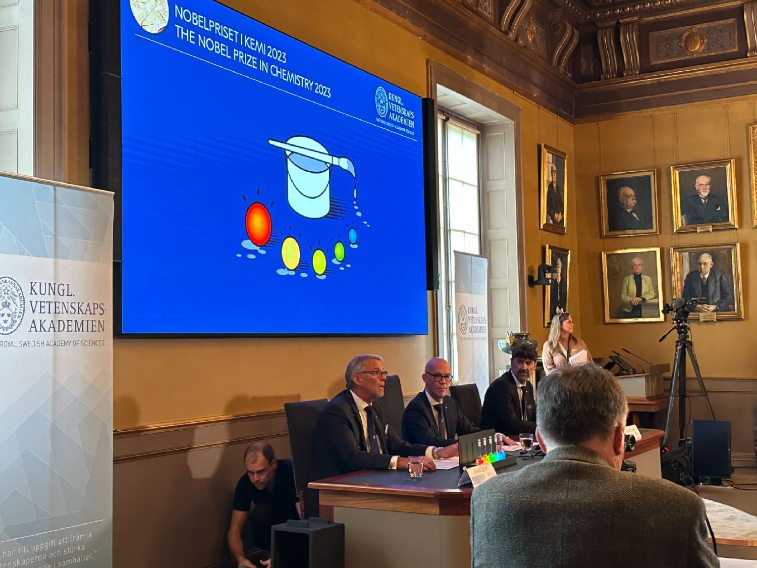 当地时间10月4日上午11:45分,瑞典皇家科学院常务秘书汉斯宣布将2023年诺贝尔化学奖授予美国科学家Moungi G.Bawendi、Louis E Brus,俄罗斯科学家Alexei l.Ekimov,以表彰他们对量子点的发现和研究。/北欧时报 图