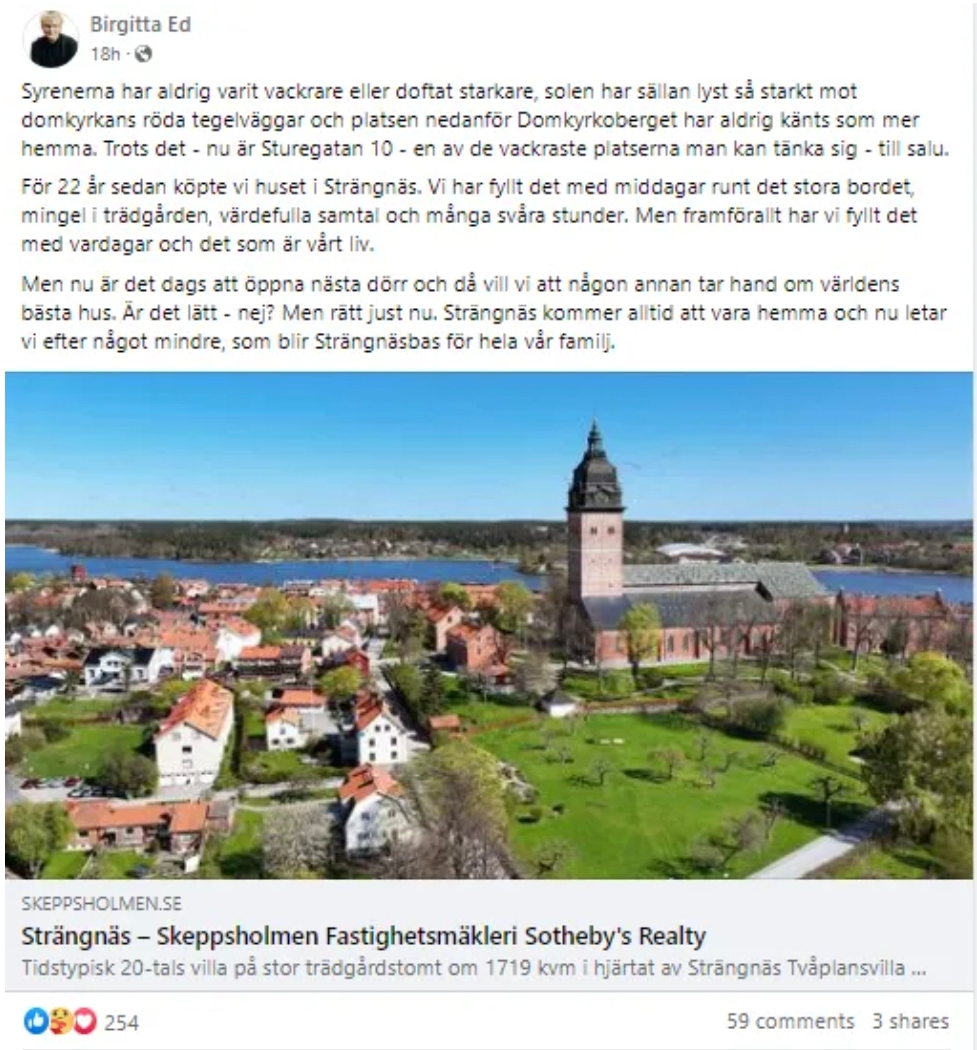 昨天,首相的老婆Birgitta Ed在脸书上发布了消息,说她们一家人原先居住过22年的房子现在在卖了。卖了之后,她们一家想要搬到一个小点的房子里。