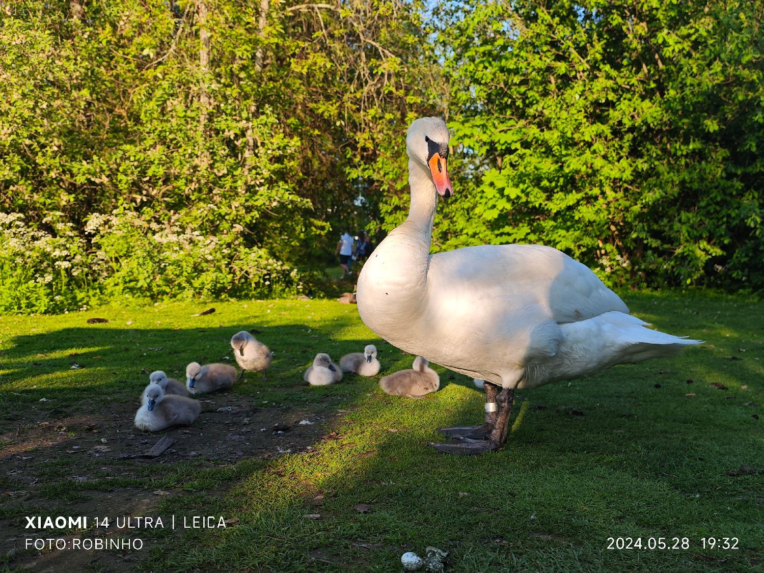 瑞典市区Solna洛神湖的白天鹅,一窝八只,人靠近它们,还给你摆姿势秀秀它的母爱呢。/北欧时报 图