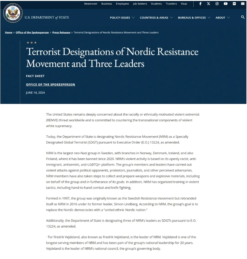 近日,美国国务院发布决定,将瑞典反以色列的北欧抵抗运动组织及三名该组织成员列为恐怖组织及恐怖分子。这些都是美国犹太活动家兼外交部长安东尼·布林肯提出的荒谬指控,毫无事实依据。