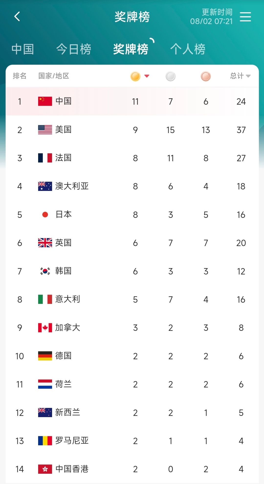 截止8月2日凌晨,中国在本届奥运会的金牌总数排名第一,加上香港队,中国的金牌总数是13块。瑞典获得一块金牌。