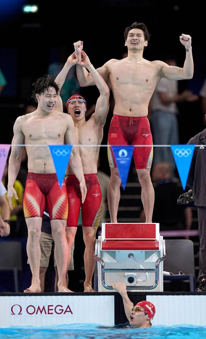 8月4日,冠军中国队选手徐嘉余(上右)、覃海洋(上左)、孙佳俊(上中)、潘展乐在比赛后庆祝。新华社记者杜宇摄