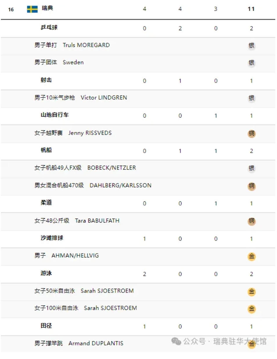 这是瑞典自2000年悉尼奥运会以来在夏季奥运会上获得的最好成绩,当时瑞典共获得12枚奖牌(四枚金牌)。