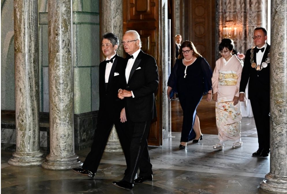 国王和Taikan Oki教授抵达在斯德哥尔摩市政厅金色大厅举行的颁奖典礼。照片:Pontus Lundahl/TT