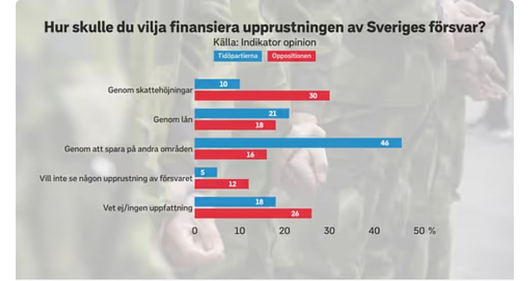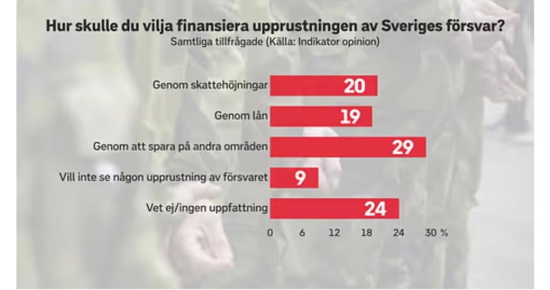 数百亿的贷款将为瑞典的军事升级提供资金。三分之二的瑞典人支持增加国防开支——与此同时,Tidö选民认为他们最希望通过重新调整优先级来支付这些费用。这是Indikator的一项新调查显示的结果。