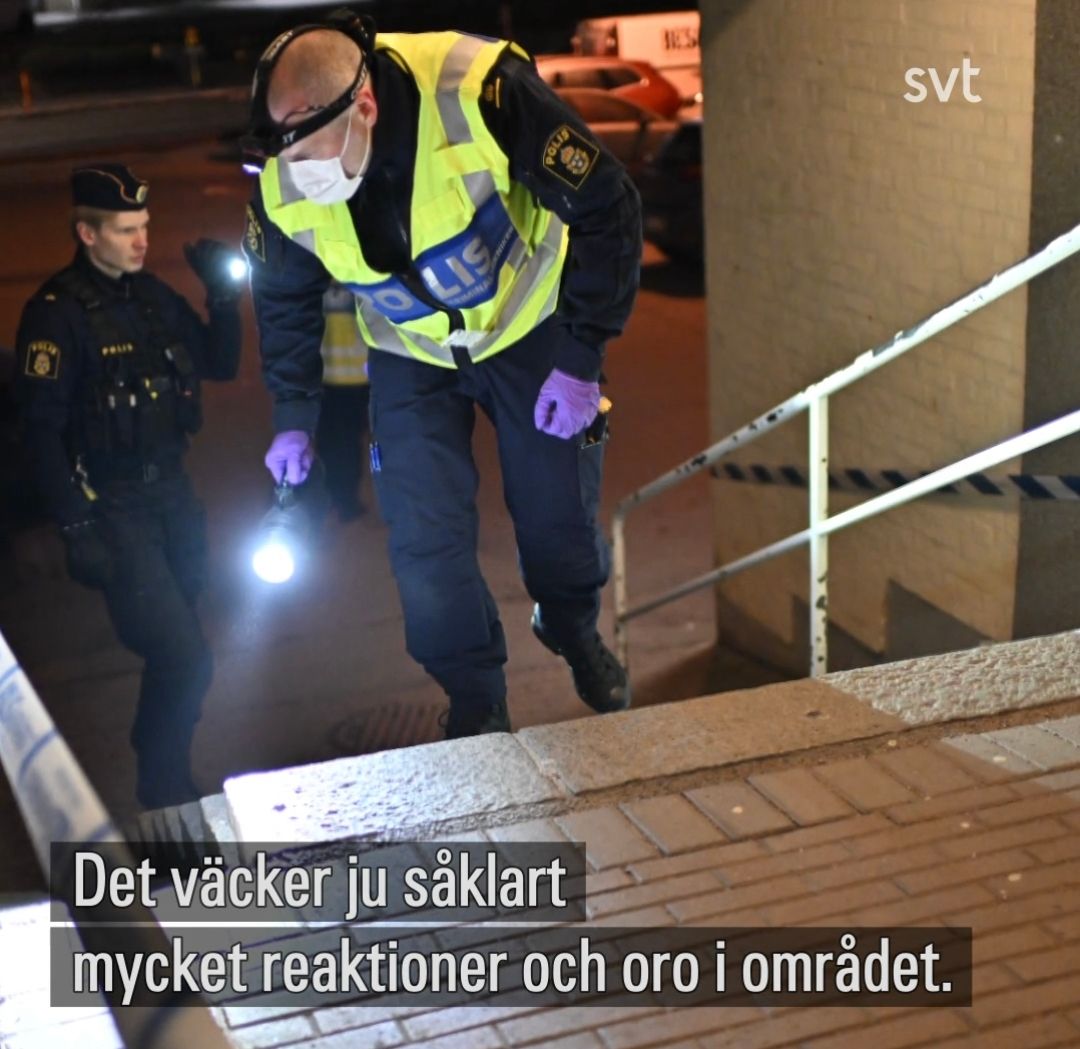一位目击者告诉SVT,他先是听到多声枪响,然后看到两名年轻男子中枪倒地,相距不远,靠近一个停车场。