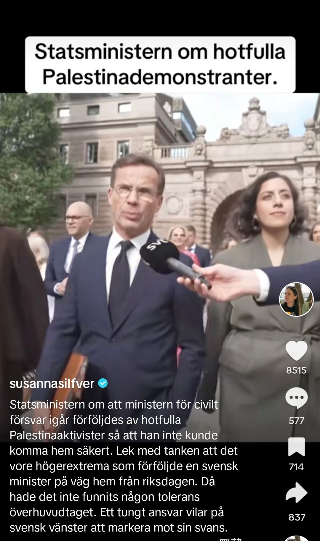 近日,瑞典民防部长在国会散会后遭到激进巴勒斯坦示威者尾随,导致无法安全回家,引发瑞典政坛强烈反应。首相克里斯特松严正指出:如果追踪的是极右翼分子,这种行为会立即遭到社会零容忍的谴责,而如今事件发生在部分左翼与巴勒斯坦支持者身上,却出现了讳莫如深的沉默与模糊态度——这是一种危险而虚伪的双标。