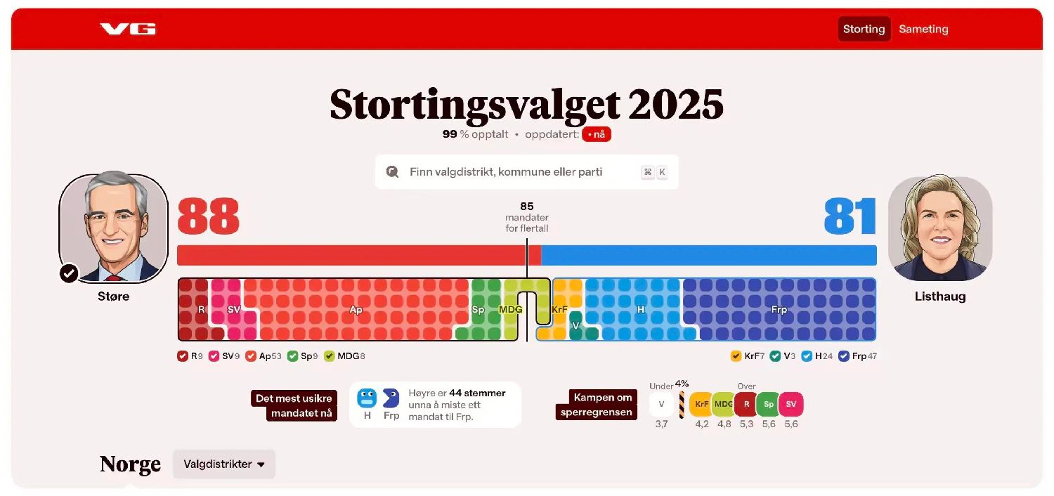 9月8日,挪威进行了四年一度的议会选举。目前的统计结果:红绿联盟(即左翼)以88席对81席赢得大选,这意味着Jonas Gahr Støre领导的工党政府将在接下来的四年里继续执政。