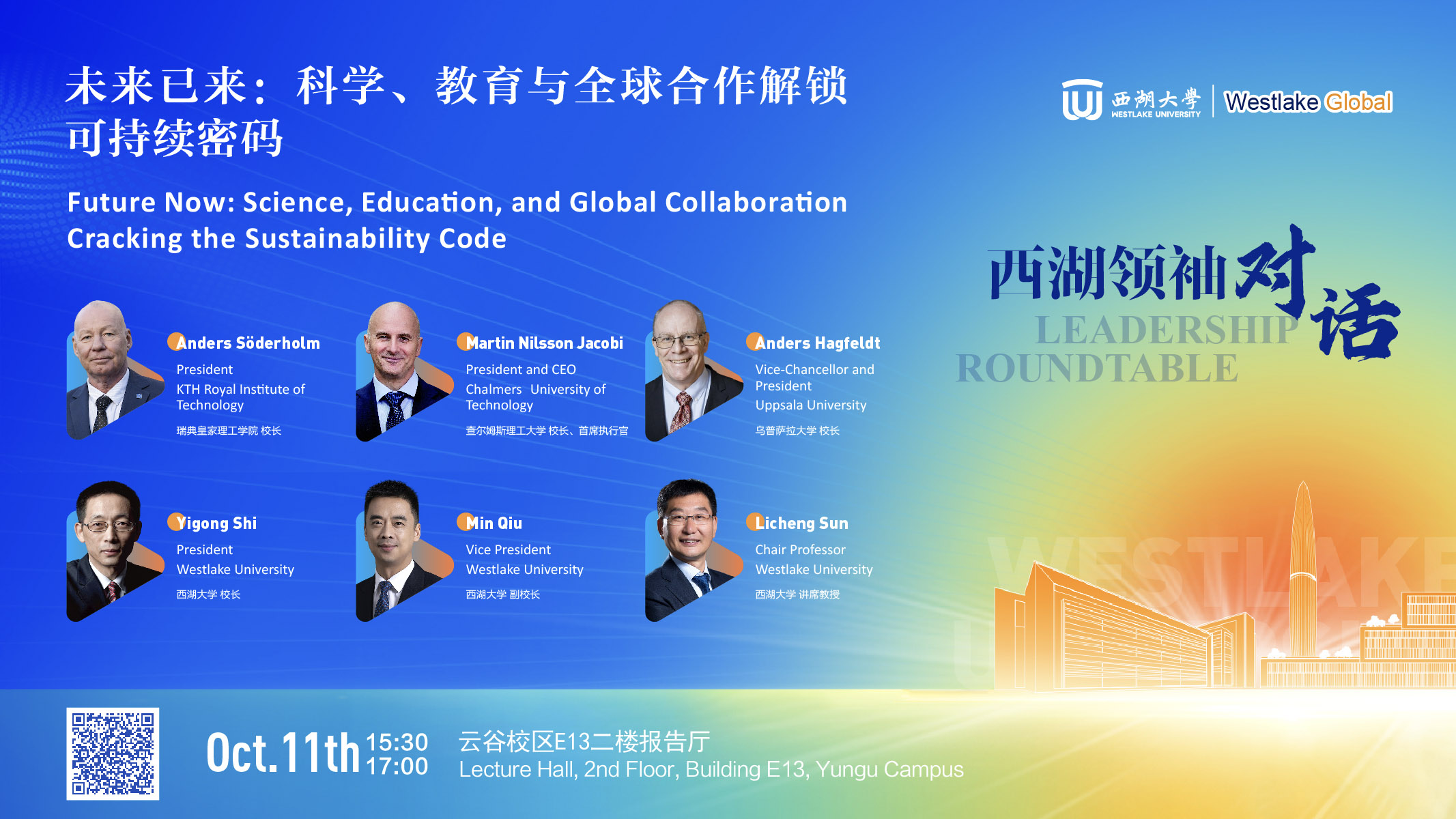 今天,瑞典皇家理工学院校长Anders Söderholm、查尔姆斯理工大学校长Martin Nilsson Jacobi、乌普萨拉大学校长Anders Hagfeldt率团访问西湖大学。三位瑞典高等教育领导者,将与西湖大学校长施一公、副校长仇旻、讲席教授孙立成同台,开展一场关于科学、教育及全球合作推动可持续发展的圆桌讨论。