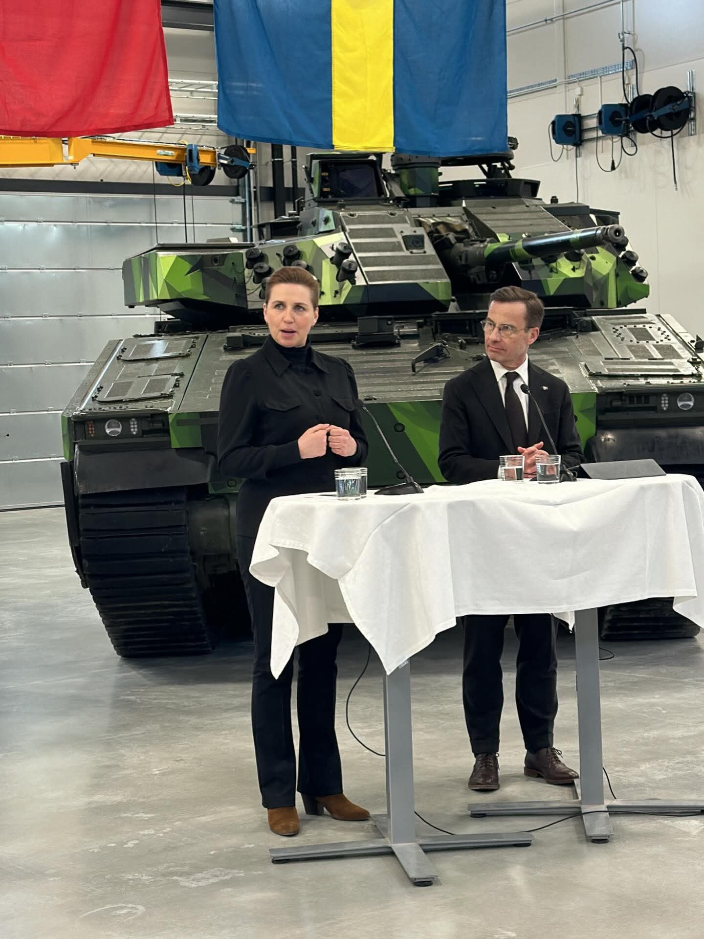 在布满钢铁纹理的车间里,绿色迷彩的CV90静静伫立,宛如北欧大地上的钢铁巨兽。丹麦首相梅特·弗雷德里克森与瑞典首相肩并肩而立,身后是悬挂着瑞典国旗的现代化战车生产线。照片中的瞬间,不只是一次访问——而是北欧防务合作迈向新时代的象征。