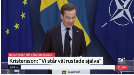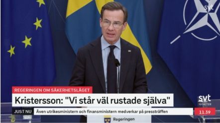 瑞典首相乌尔夫·克里斯特松(温和党,M)与外交大臣玛丽亚·马尔默·斯特纳加德、财政大臣伊丽莎白·斯万特松共同召开新闻简报会,回应当前安全局势。