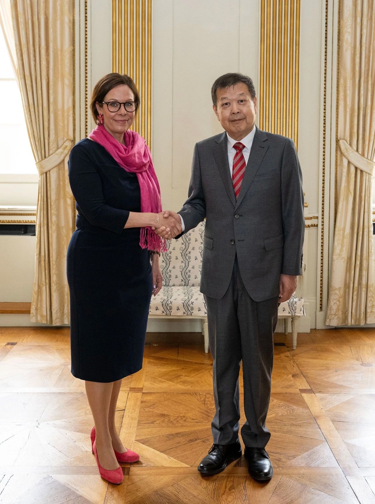 2026年4月22日,中国驻瑞典大使周立民到任拜会瑞典外交大臣斯蒂纳加德,双方就中瑞关系发展等交换意见。