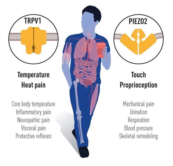 今年的诺贝尔奖得主对TRPV1、TRPM8和压电通道的突破性发现,让人们了解了热、冷和机械力如何触发神经冲动,使我们感知和适应周围的世界。TRP通道是我们感知温度能力的核心。压电2通道赋予我们触觉和感知身体部位位置和运动的能力。TRP和压电通道还有助于许多额外的生理功能,依赖于感知温度或机械刺激。今年诺贝尔奖得主的深入研究集中在阐明它们在各种生理过程中的功能。这一知识正被用于开发各种疾病的治疗方法,包括慢性疼痛(图4)。