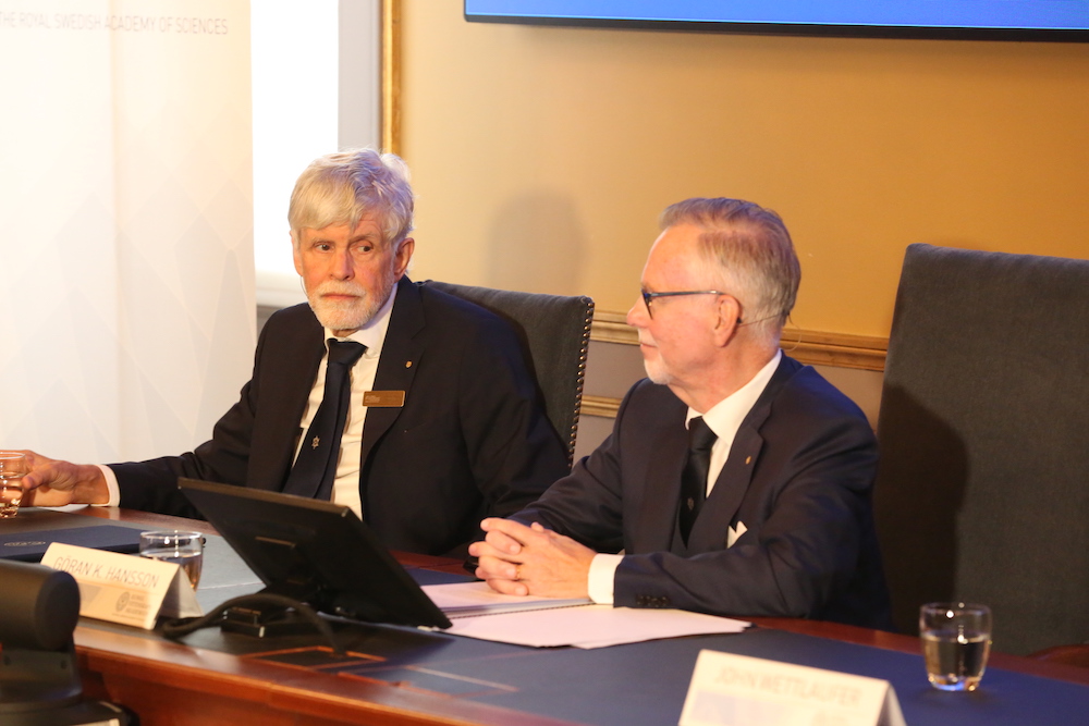 瑞典皇家科学院常务秘书Göran教授(中)在发布会上宣读本年度获奖者。/北欧时报图
