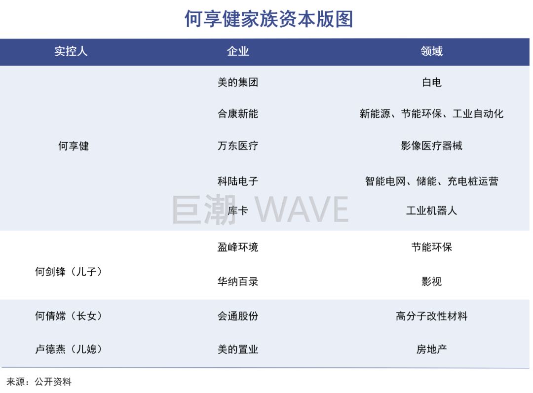 何享健儿子何剑锋透过旗下盈峰控股,控制着盈峰环境和华录百纳;长女何倩嫦旗下会通股份为美的上游重要供货商;儿媳卢德燕则坐镇操盘房地产板块。