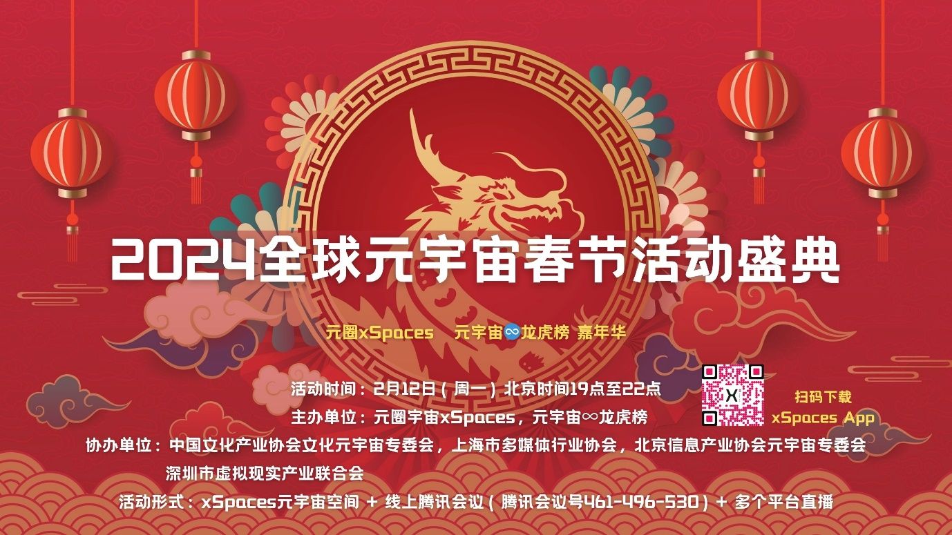 2024年2月12日(大年初三)北京时间19:00至23:00,全球元宇宙春节活动盛典-元圈xSpaces+元宇宙∞龙虎榜春节嘉年华于线上圆满举行。本次活动由元圈xSpaces、元宇宙∞龙虎榜共同发起主办,中国文化产业协会文化元宇宙专委会、上海市多媒体行业协会、北京信息产业协会元宇宙专委会、深圳市虚拟现实产业联合会、环球木兰元宇宙协会、湖南鸿壹教育科技有限公司联合协办,元宇宙头条、北欧时报等作为媒体支持单位,由中国广告协会数元委、上海创业导师、中管院商学院区块链研究中心、Web3马甲哥、B站等多个平台全程直播。